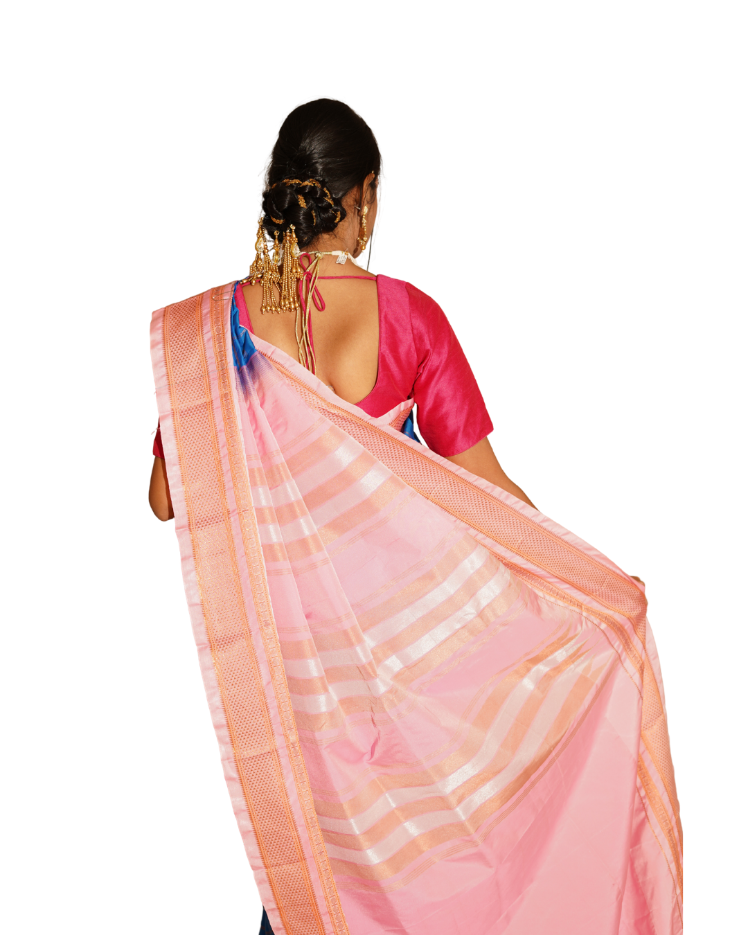 Celebrate timeless Maharashtrian elegance with this stunning blue Paithani saree, adorned with a classic temple border and delicate woven motifs across the body. The rich contrast pink border and pallu enhance its traditional charm, while the vibrant color palette makes it perfect for festive and ceremonial wear. Crafted with finesse, this saree reflects the heritage artistry of Paithani weaving and drapes beautifully for a graceful look.