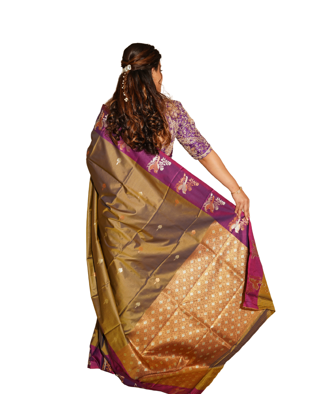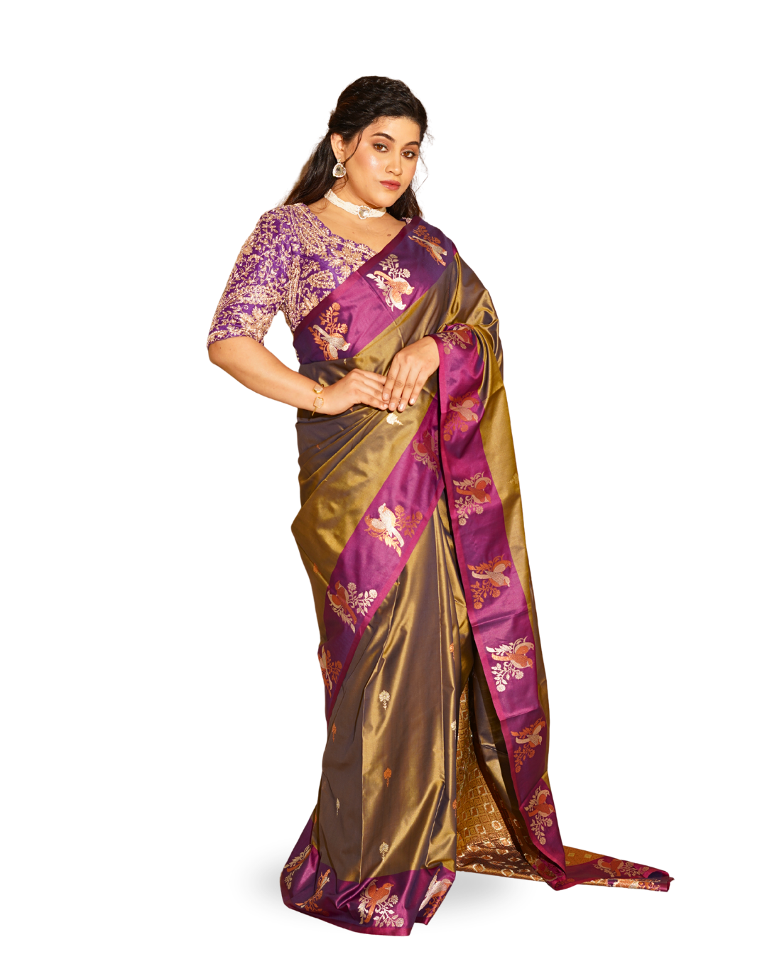 This beautiful saree features a rich combination of copper gold  and purple shades with a glossy finish that adds instant elegance. The smooth drape and subtle woven motifs give it a classy and traditional look. Perfect for weddings, festive occasions, parties, and special functions, this saree offers both comfort and style for long hours of wear.