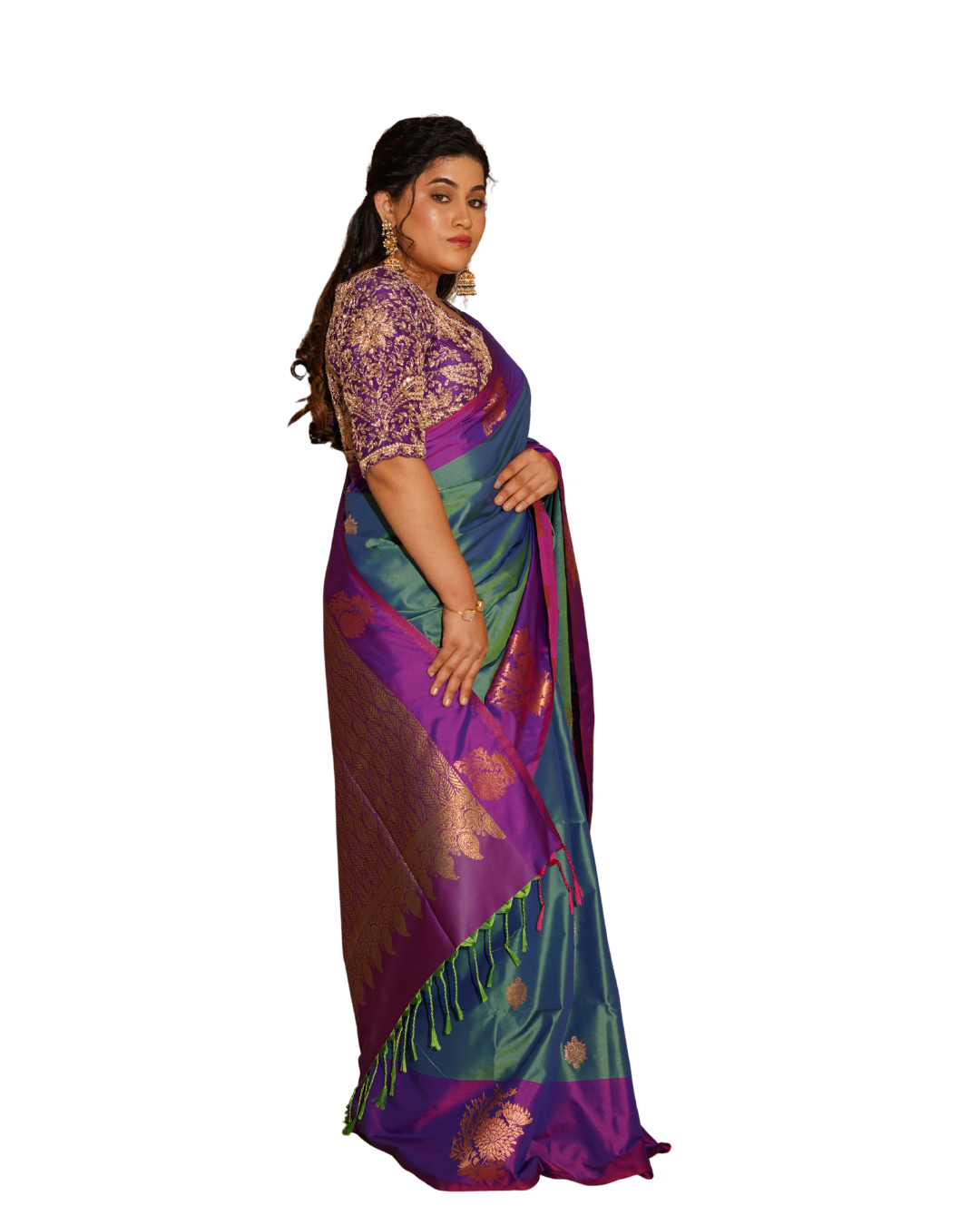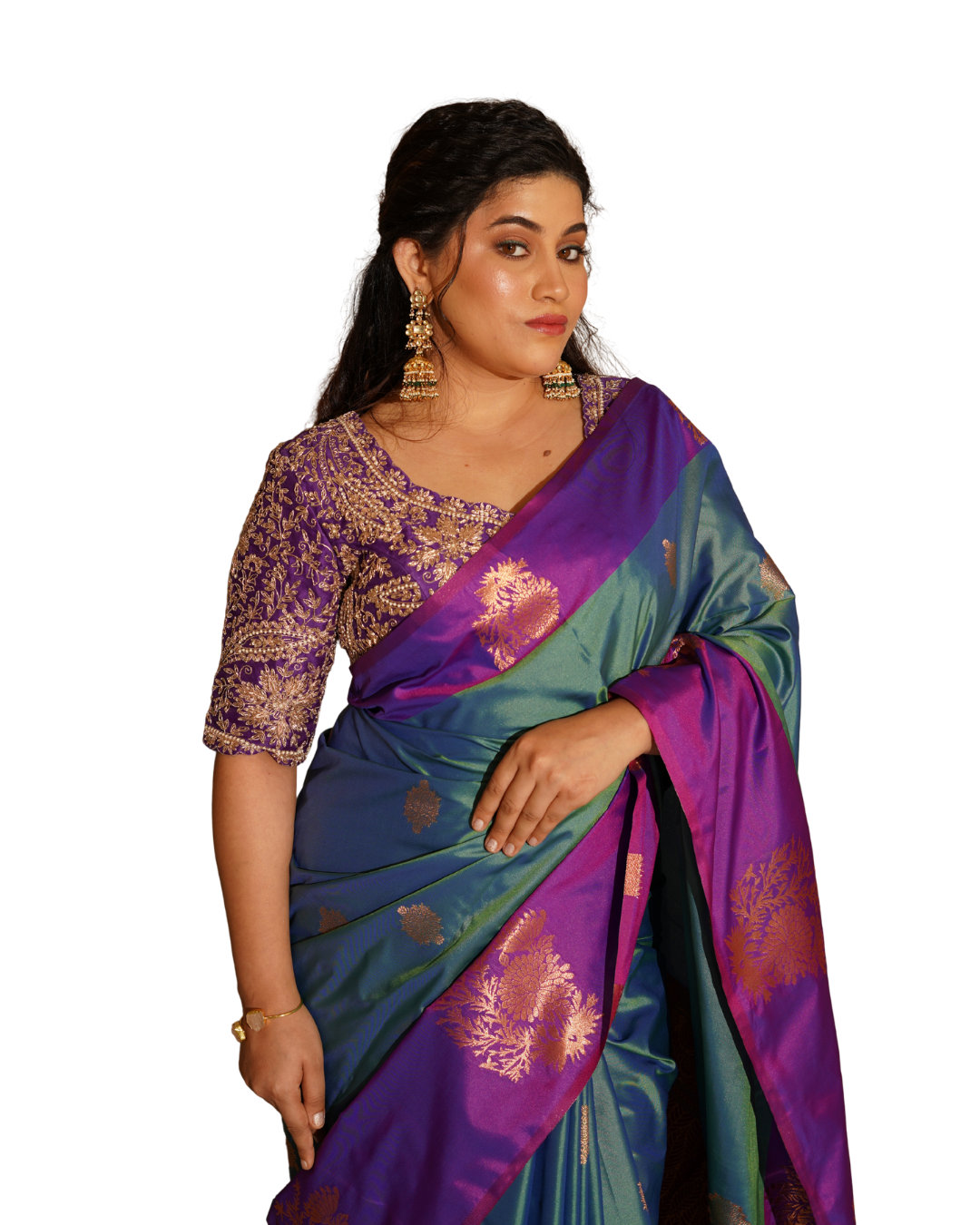 This beautiful saree features a rich combination of royal blue and purple shades with a glossy finish that adds instant elegance. The smooth drape and subtle woven motifs give it a classy and traditional look. Perfect for weddings, festive occasions, parties, and special functions, this saree offers both comfort and style for long hours of wear.