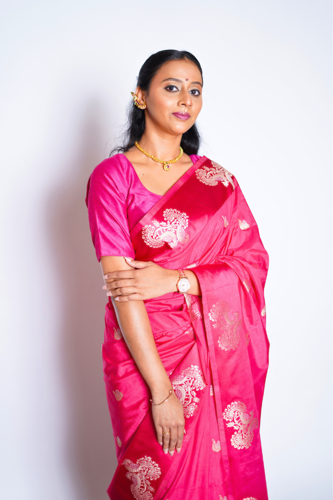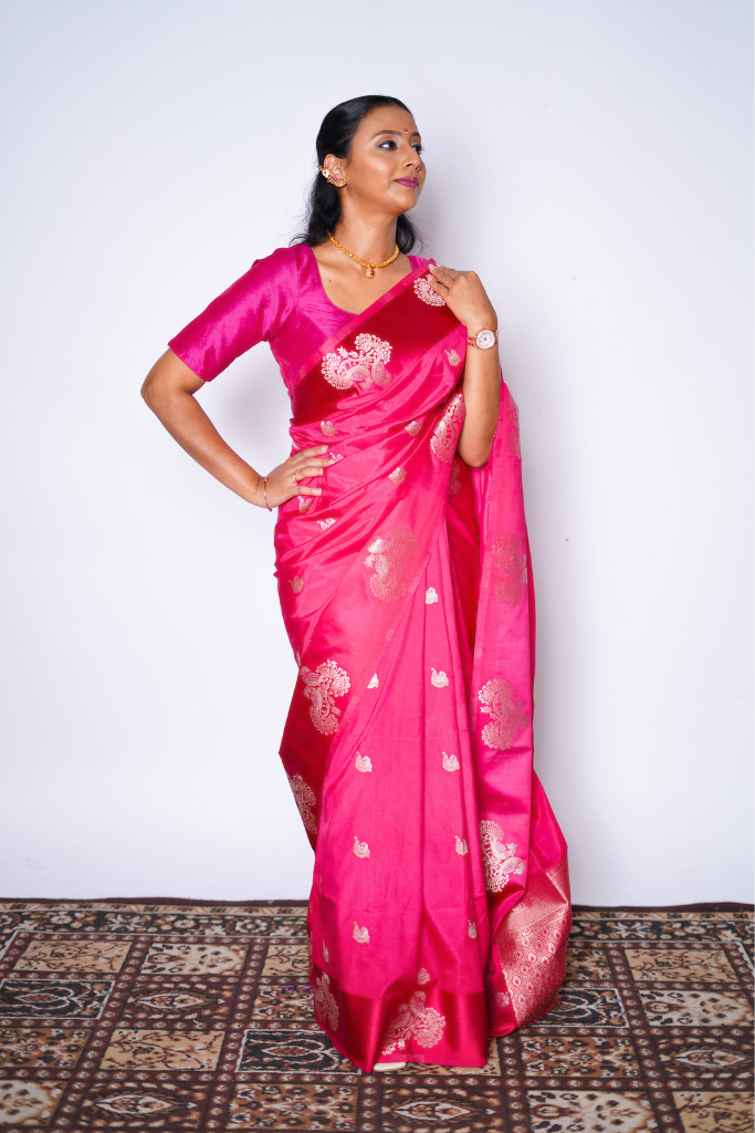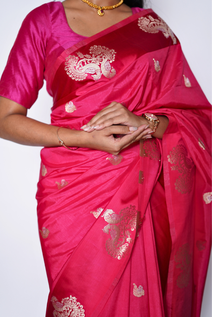 Dazzle in this gorgeous fuchsia pink saree! Gold embroidered peacocks add a touch of majesty.Perfect For Diwali,weddings,or any festive occasion in india.Blend tradition with glamour for your special moments. (The blouse is unstich will come with same colour of saree)contrast shown on photo are not actual blouse of saree.