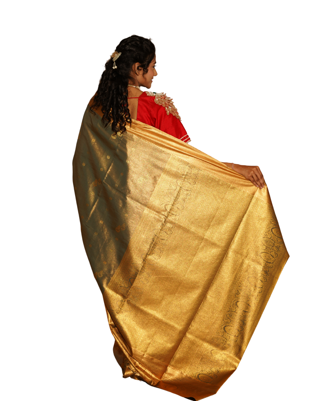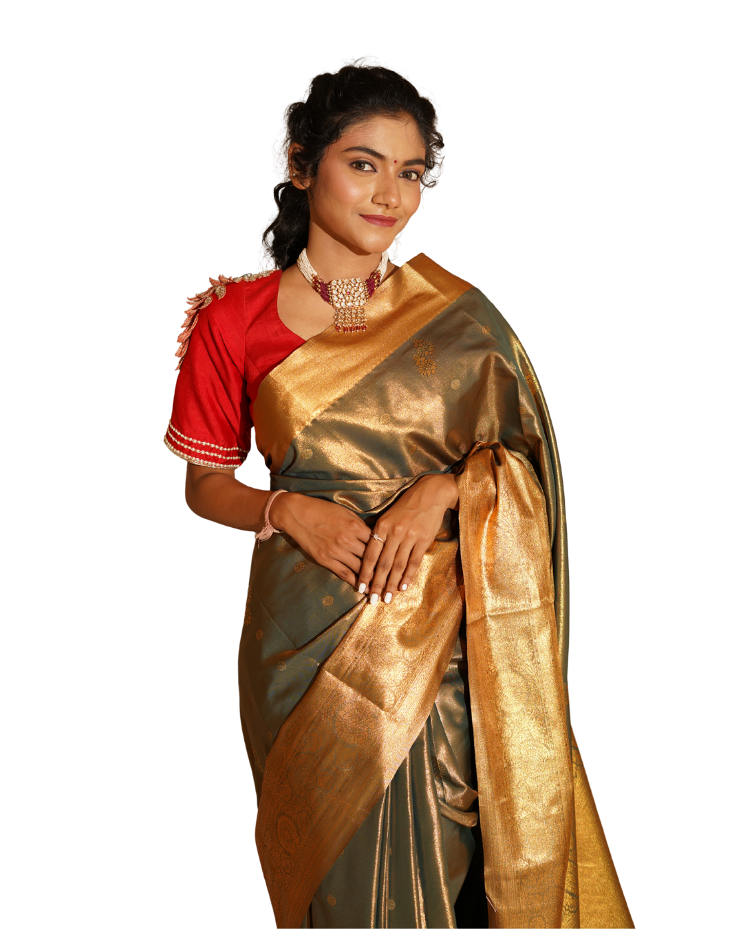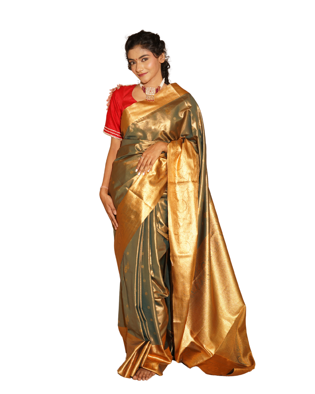 Add timeless elegance to your ethnic wardrobe with this exquisite olive green tissue silk saree, crafted to offer a luminous sheen and an effortlessly graceful drape. The saree features a rich tissue silk base adorned with delicate woven motifs, beautifully complemented by a broad zari border and a luxurious pallu that enhances its festive appeal. The lightweight yet rich texture of tissue silk makes it comfortable to wear while maintaining a regal look, perfect for weddings, festive gatherings, and traditional celebrations.