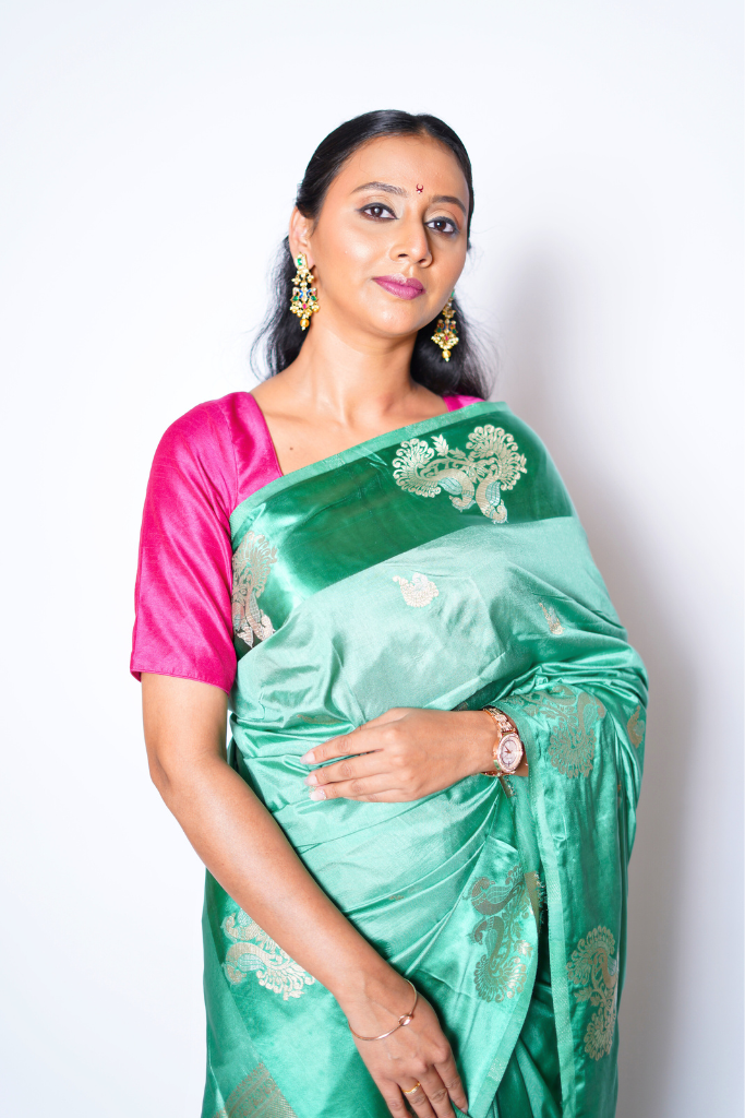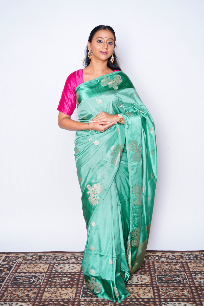 This Sage green saree boasts intricate gold embroidery with floral or peacock motifs.The pallu features a beautifully crafted gold design with tassels.Versatile & Elegant: Perfect for weddings, parties, or casual gatherings, combining timeless elegance with modern charm. (The blouse is unstich will come with same colour of saree)contrast shown on photo are not actual blouse of saree