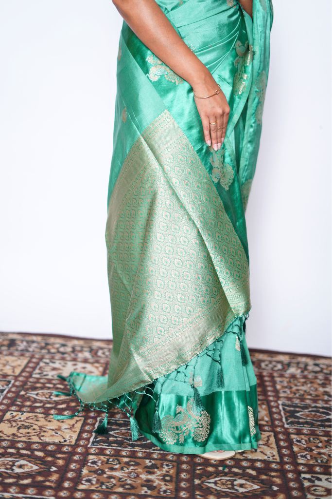 Sage Green Saree with Gold Embroidery and Pallu Tassels